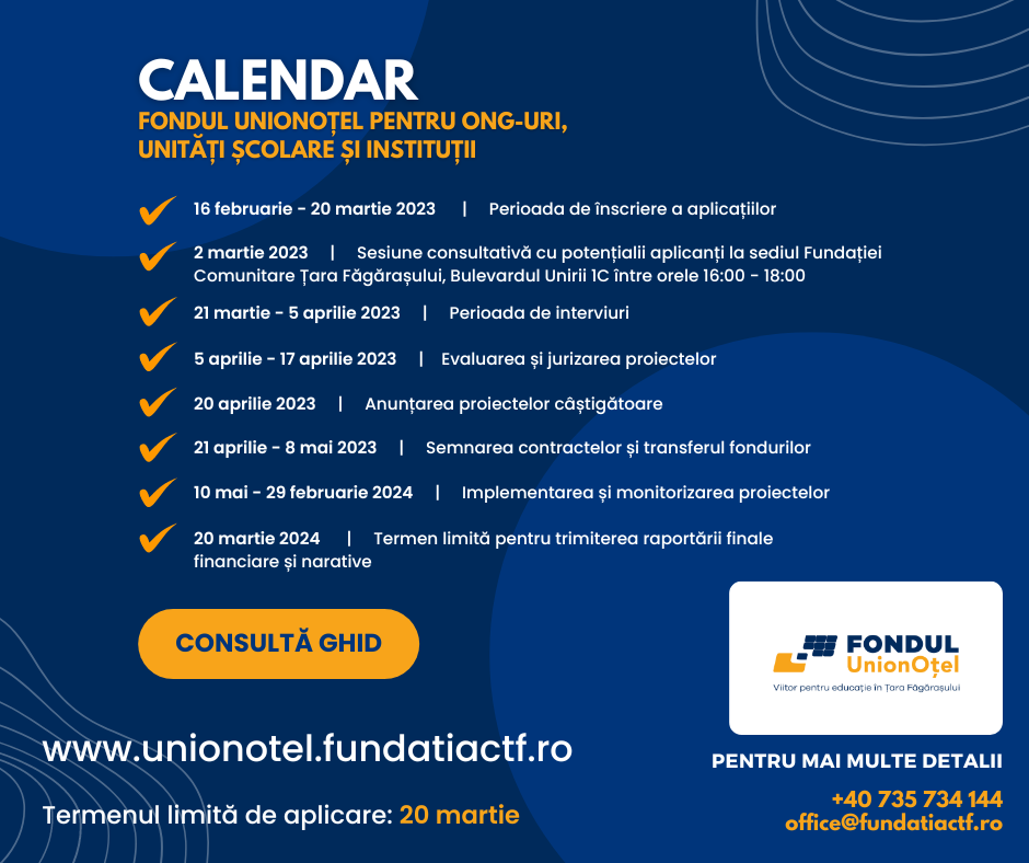 Prin Fondul UnionOțel – Viitor pentru Educație în Țara Făgărașului secțiunea Granturi pentru ONG-uri, unități școlare și instituții (muzee, biblioteci, cluburi ale elevilor) ne dorim să susținem acele proiecte educaționale care pun focus pe infrastructura școlară de bază, infrastructură digitală, STEAM (științe, tehnologie, inginerie, arte și matematică, infrastructură sportive (dotări), meșteșuguri și meserii, diverse abilități practice/vocaționale, etc., care au ca scop dezvoltarea unor programe de lungă durată, posibil replicabile, menite să dezvolte abilitățile elevilor și care să ajute la reducerea alfabetismului funcțional.